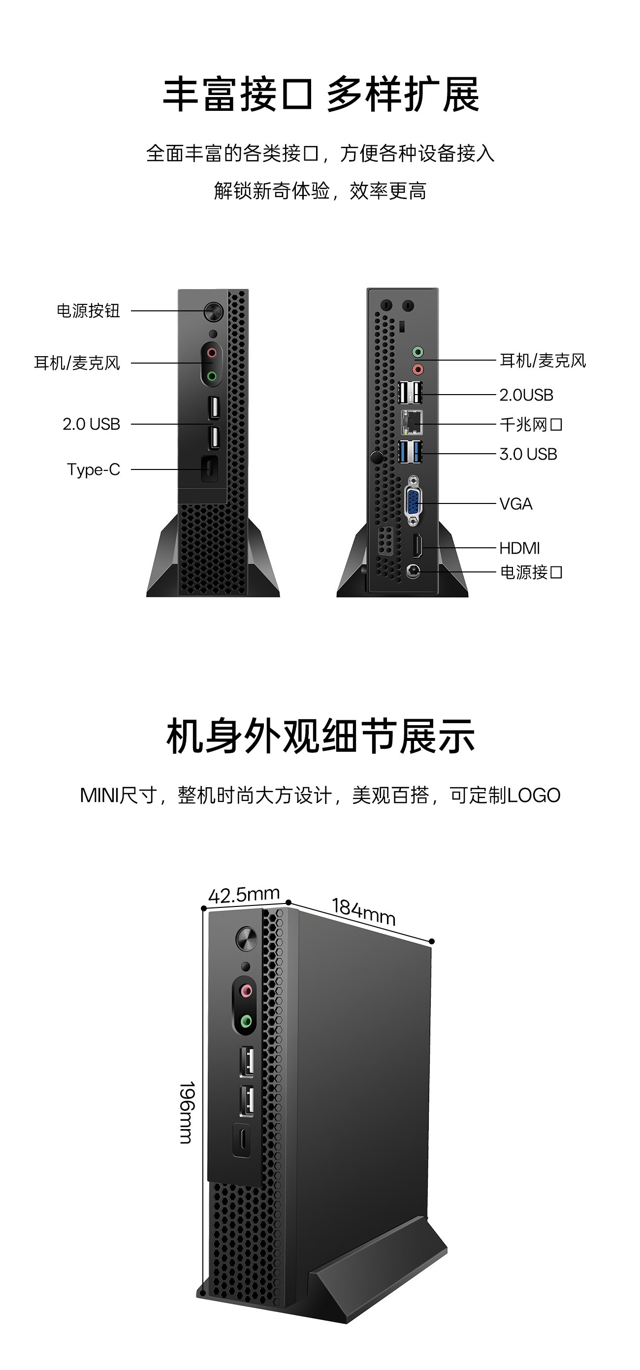 前置:USB2.0*2;type-c*1、后置:DC*1,HDMl+VGA,4*USB3.0,1*RJ45,音频输入*1,音频输出*1 |